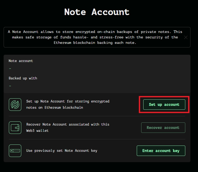A Note Account allows to store encrypted on-chain backups of private notes. This makes safe storage of funds hassle- and stress-free with the security of the Ethereum blockchain backing each note.