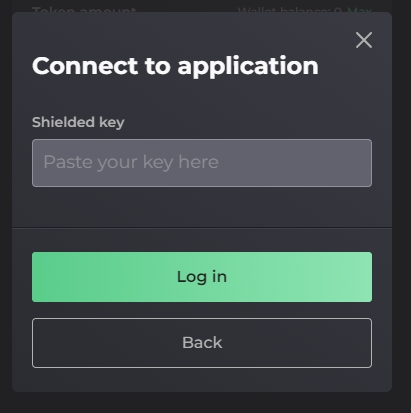 As seen above, the other way to log in is through the generated Shielded Key that is created when an account is created through the set up of a new shielded address.