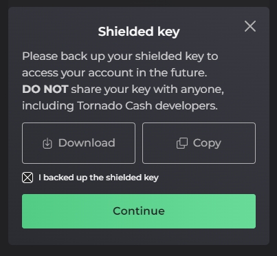 Set up account.A pop-up window will appear for you to save your shielded key (do not share this key !)