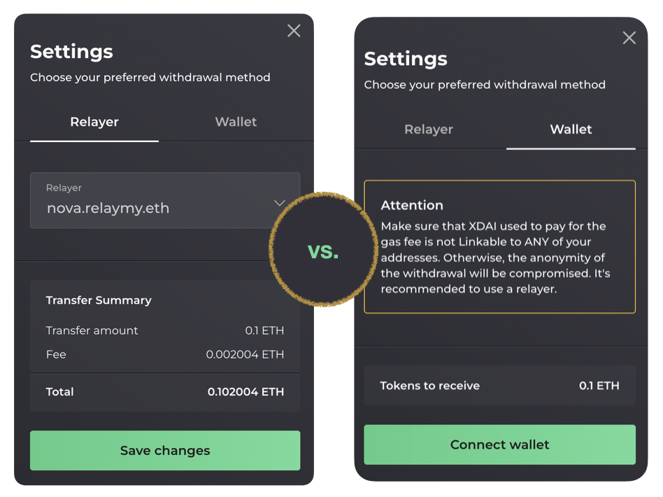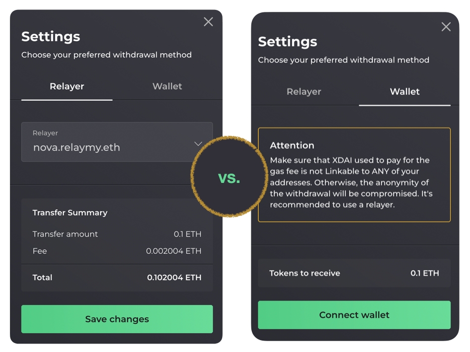 Gas fees payments are necessary for transactions. For shielded transfers & withdrawals, two payment methods are available to provide ETH for gas fee. You can either connect your wallet or use a Relayer.